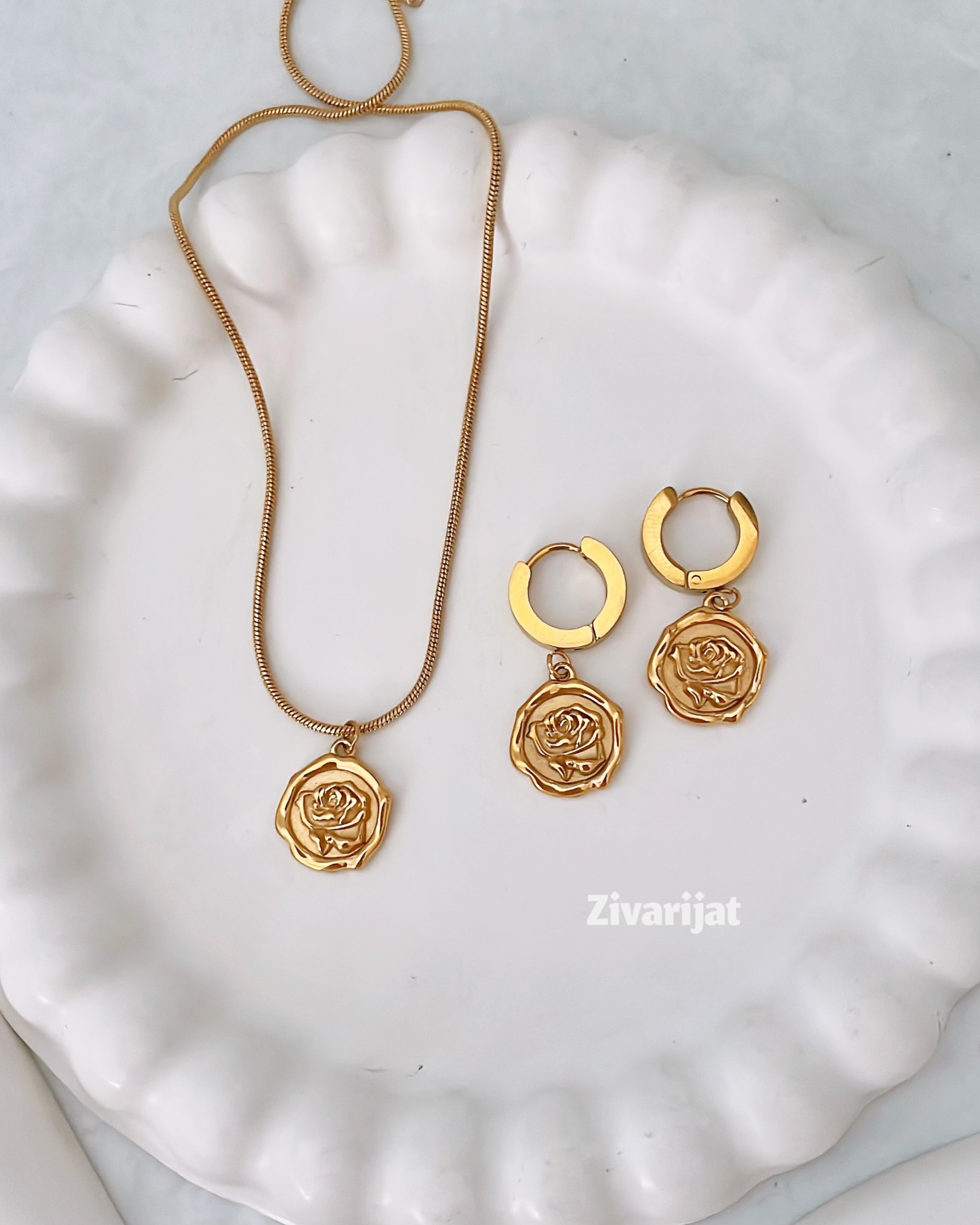 که گوشواره قفل حلقهای دارد و گردنبند زنجیر ماری باریک و ضدحساسیت و اندازه بلندی ۴۵ سانتی و ۵سانت زنجیر سایزر دارد