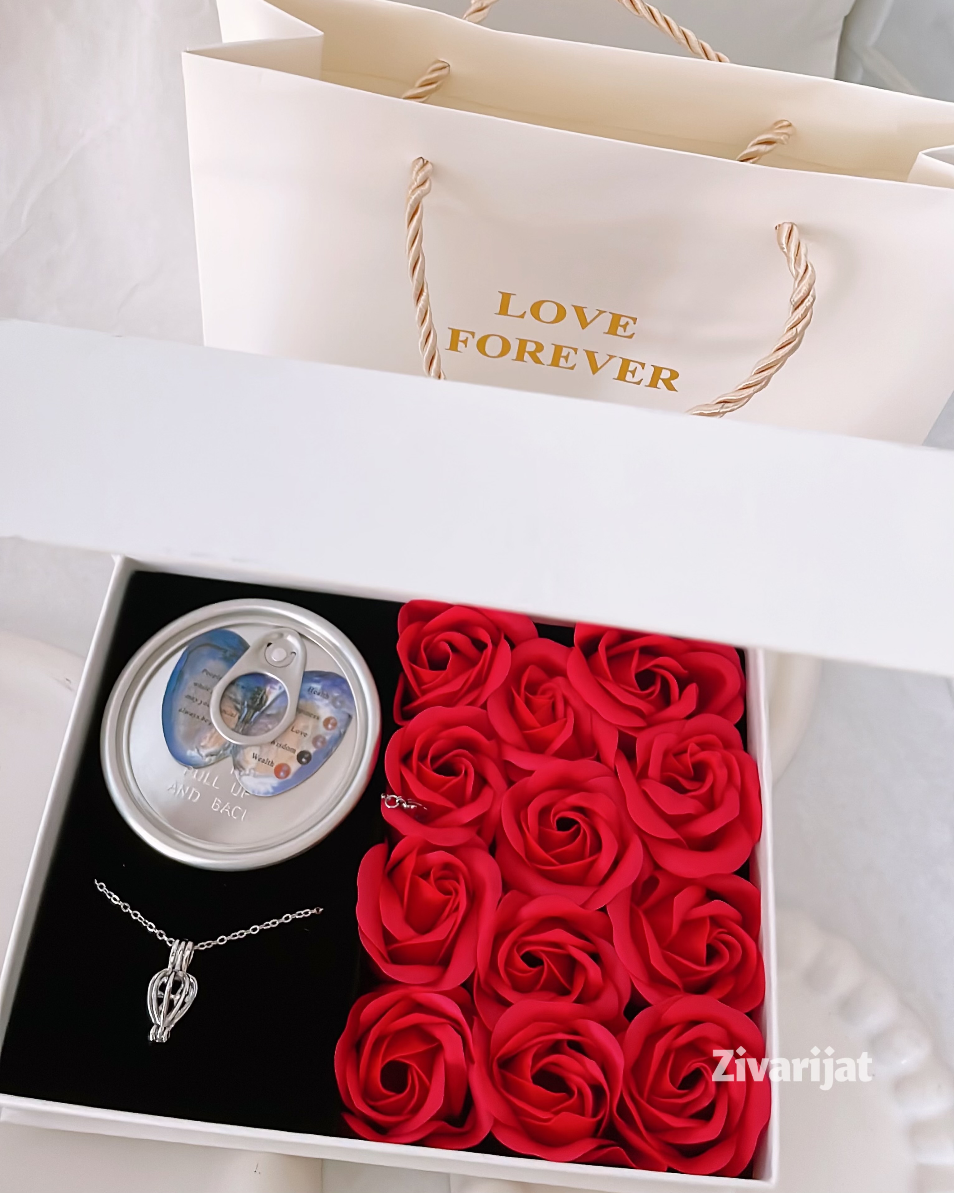 باکس گل رز که گردنبند مروارید عشق و صدفی که داخل کنسرو قرار دارد مناسب هدیه تولد و هدیه عاشقانه ولنتاین