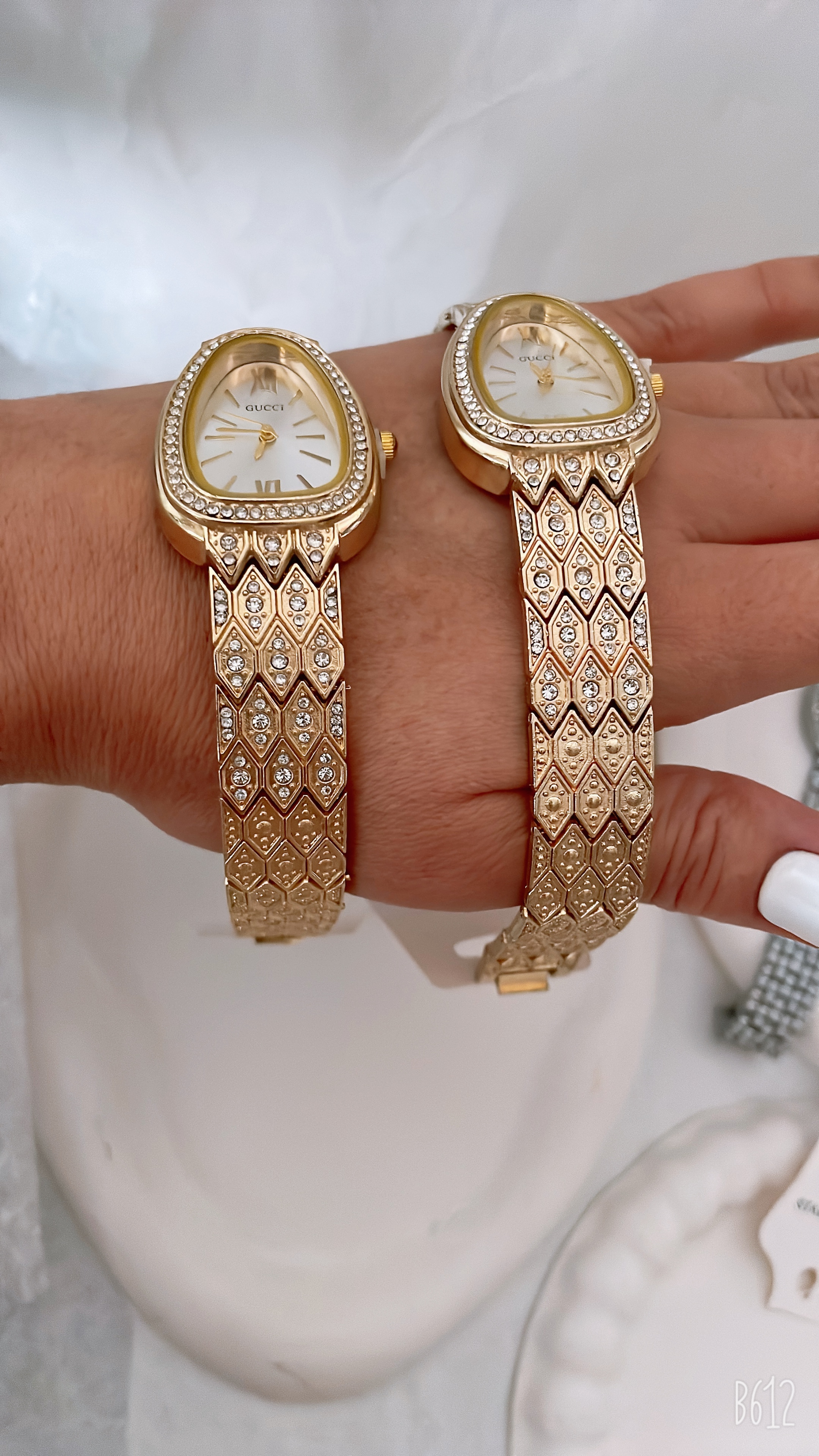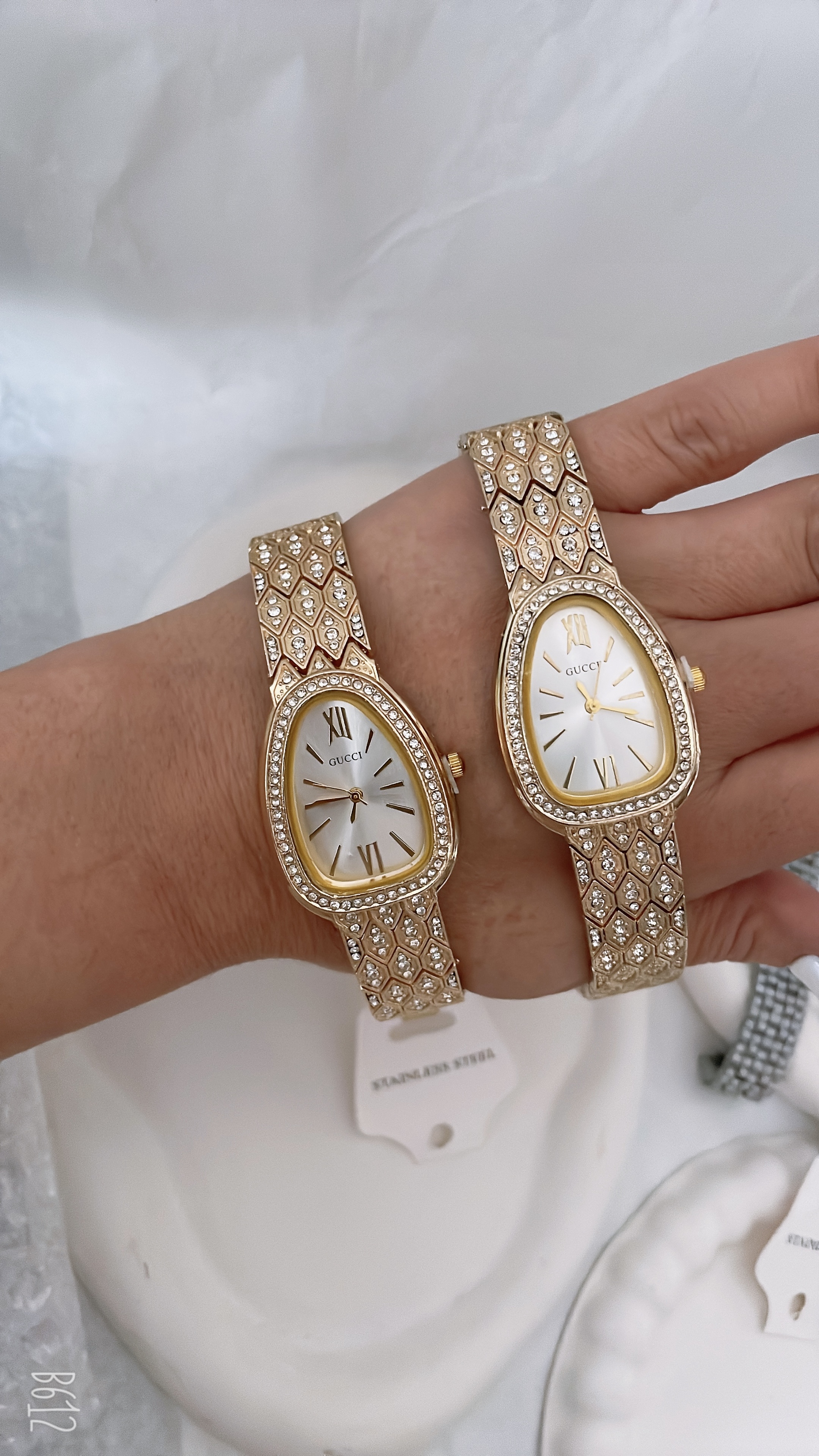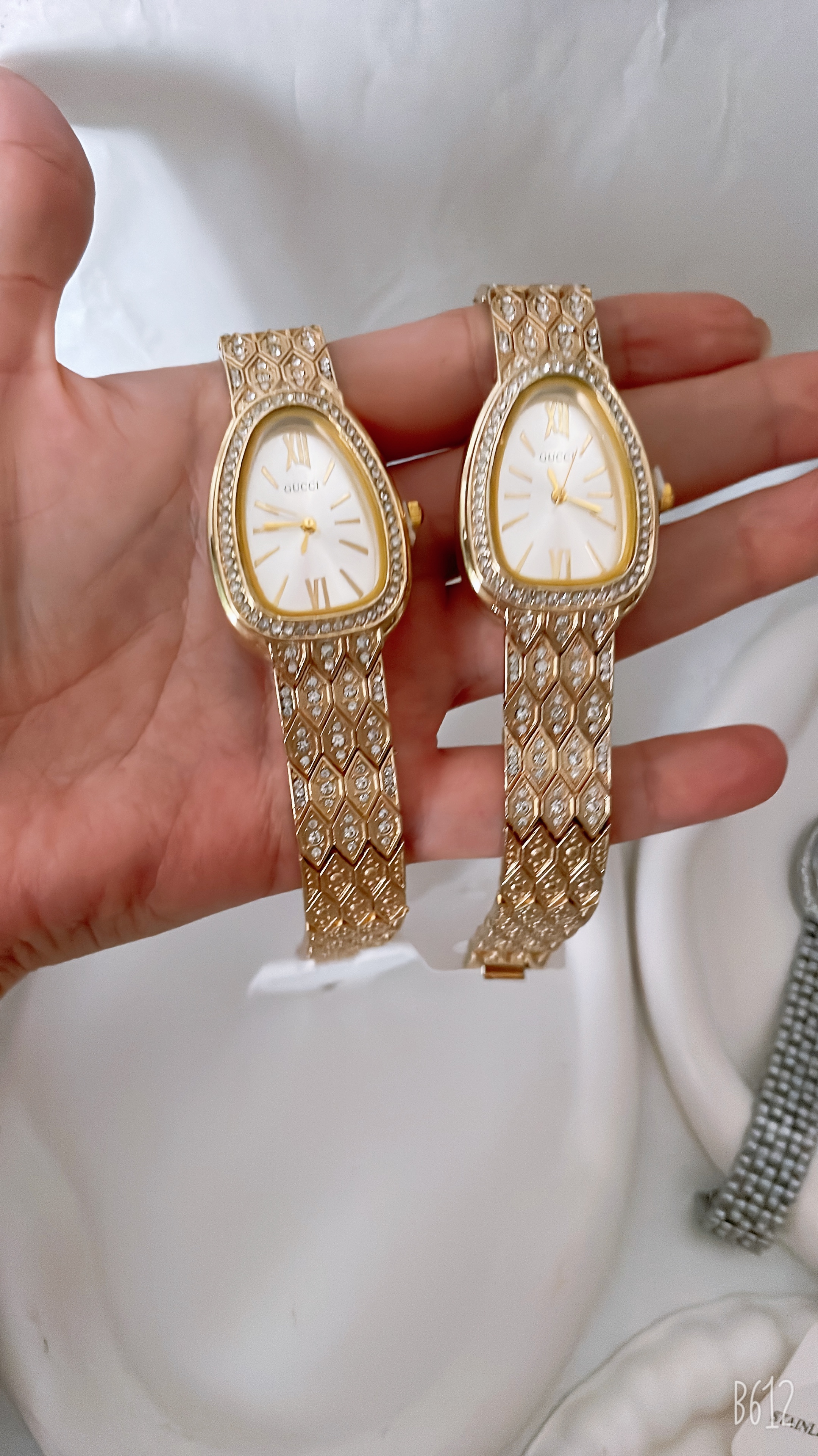 ساعت مچی زنانه و دخترانه استیل طلایی قفل رولکسی و باطری قابل تعویض نگینها ریزش ندارد مناسب تا دور مچ ۲۰سانتی هم میشود