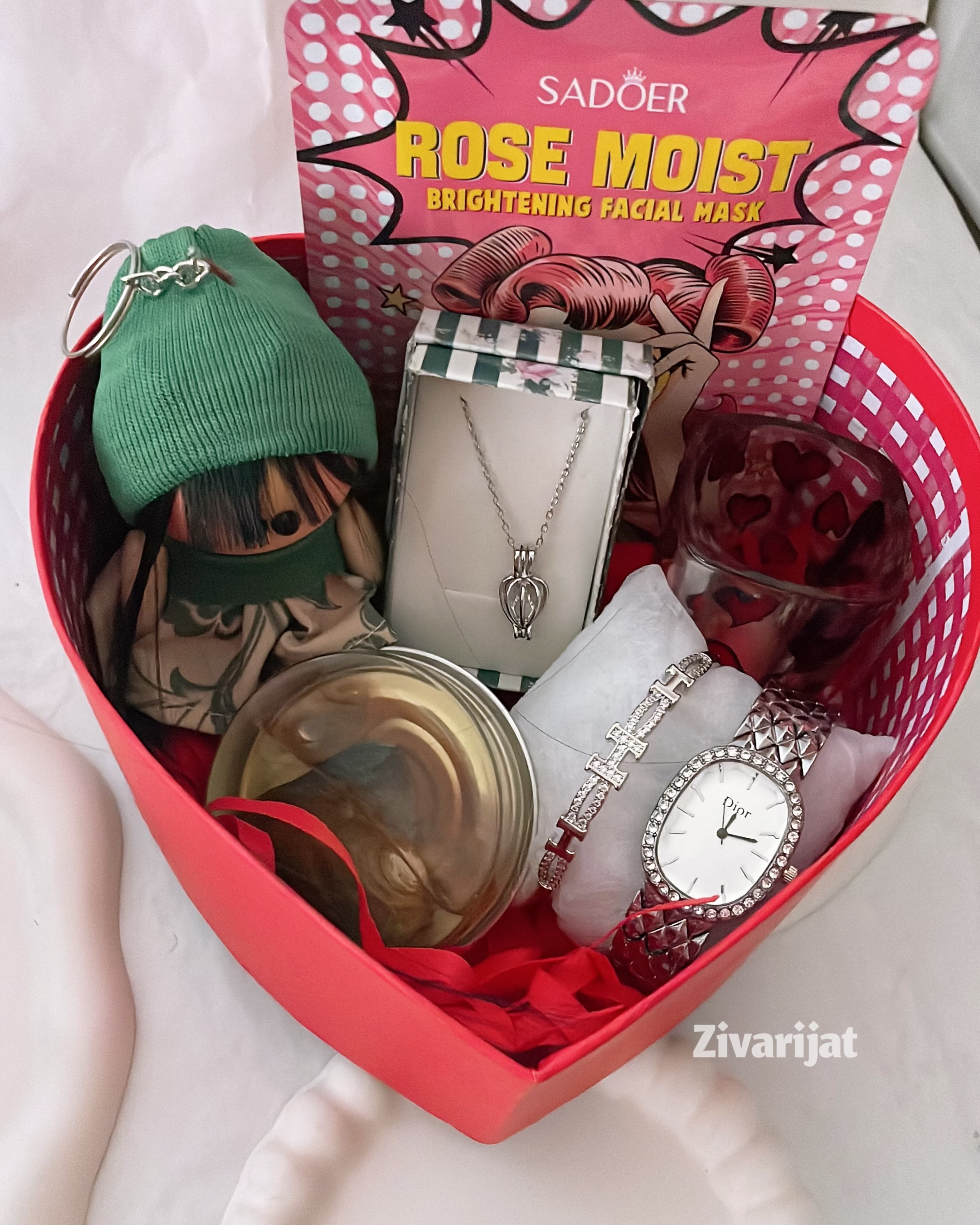 هارد باکس قلبی در دار شامل گردنبند مروارید عشق و ماسک صورت و عروسک آویزی و ساعت و بنگل استیل رنگ ثابت و